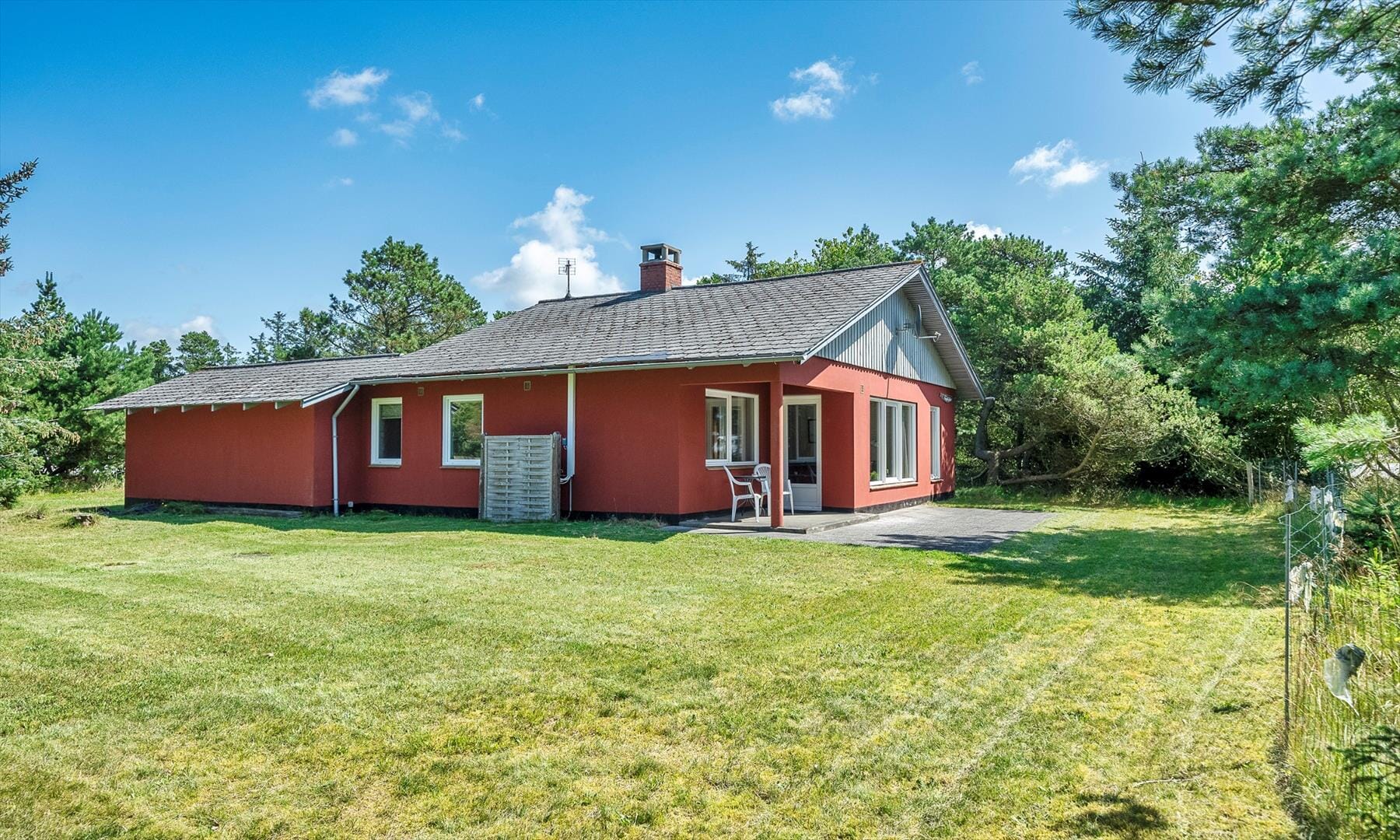 Udenfor får du en dejlig, lukket terrasse med komfortable havemøbler og liggestole, et ugeneret fristed hvor du kan nyde solen eller søge læ for vinden i rolige omgivelser. Terrassen er designet til både morgenkaffen alene og hyggelige aftener i godt selskab, og den lukkede karakter giver en følelse af privatliv midt i naturen. Den velplejede græsplæne omkring huset indbyder til leg og boldspil; her kan de små udfolde sig trygt, mens de voksne slapper af, og du kan følge dagens skiften fra en liggestol. Kombinationen af en fredelig terrasse og den nære kystluft gør det let at lade tempoet falde og mærke feriestemningen sænke sig.