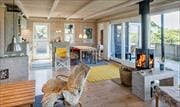 Indenfor møder du et lyst og gennemtænkt rum, hvor indretningen skaber en rar og ubesværet atmosfære. Det store sofahjørne er perfekt placeret overfor brændeovnen, så I naturligt samles omkring varme, lys og samtaler, mens dagens oplevelser får lov at bundfælde sig. Køkkenet er praktisk indrettet med god oversigt over hele opholdsrummet, hvilket gør det nemt at lave mad og stadig være en del af selskabet – uanset om det er morgenkaffe, fælles frokost eller en rolig aftenmenu. Materialevalg og farver er afdæmpede og behagelige, så opmærksomheden i stedet kan rettes mod samværet, udsigten fra vinduerne og de små daglige glæder ved et velplanlagt sommerhus.