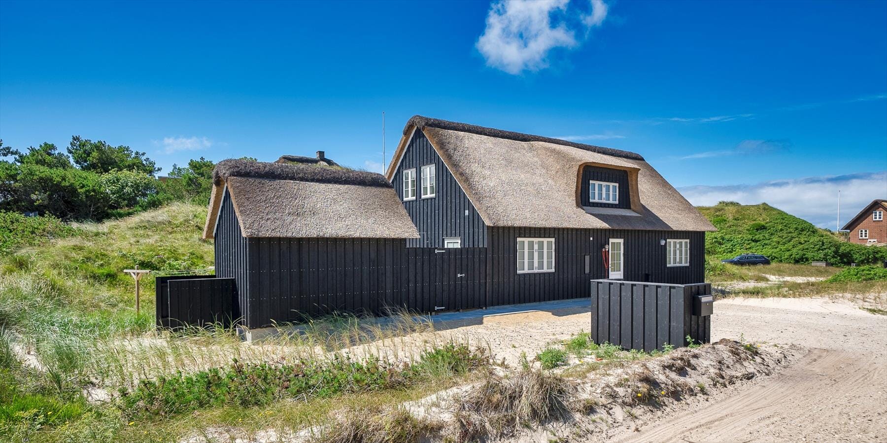 Hus-ID: VE126Sommerhuset er bygget i kvalitetsmaterialer, i et moderne og trendy design, som passer godt ind i omgivelserne. Sommerhuset er på i alt 157 m2. Sommerhuset byder på en skøn atmosfære i en moderne, nordisk stil. De udvendige faciliteter byder på flotte solnedgange, der kan nydes fra den omkringliggende terrasse. Sommerhuset ligger på en klitgrund, ca. 400 meter fra stranden samt kort afstand til indkøb og restaurant. Grunden grænser op til større fredet naturområde mod nord, hvor man har mulighed for at gå gåture i klitplantagen eller på stranden. Huset indeholder: entré med opgang til første sal. 4 gode soveværelser, hvor 3 befinder sig på første sal. Første sal: 1 soveværelse med 1 dobbeltseng (180 cm x 200 cm) og 2 soveværelser med hver 2 enkeltsenge (4 x 90 cm x 200 cm). Soveværelse i stueplan: 1 dobbeltseng (180 cm x 200 cm). Et masterbadeværelse med bruser, vaskearrangement, toilet, vaskemaskine og tørretumbler. Sauna. Gæstetoilet på første sal med bruser, toilet og vaskearrangement. Køkkenet fremstår med alt komfort og er med bageovn, kogeplader, emhætte, køle-fryseskab og opvaskemaskine. Spiseafdelingen og stuen er i åben forbindelse med køkkenet. Rummet er lyst og venligt indrettet med sofa- og hyggehjørne. Huset har et dejligt terrassemiljø, hvor der forefindes en kulgrill samt udebruser, der er tilsluttet om sommeren. Privat lade-stander til elbiler. Danske tv-programmer via Smart-Tv (DR programmer). Trådløs Internetadgang. Radio. Huset opvarmes med gulvvarme/luft til vand varmepumpe i stueplan og med elradiatorer på 1. sal.. Varmepumpen og den moderne isolering sikrer et lavt energiforbrug til opvarmningen af huset. Husdyr og rygning er ikke tilladt. Huset er bygget 2022.