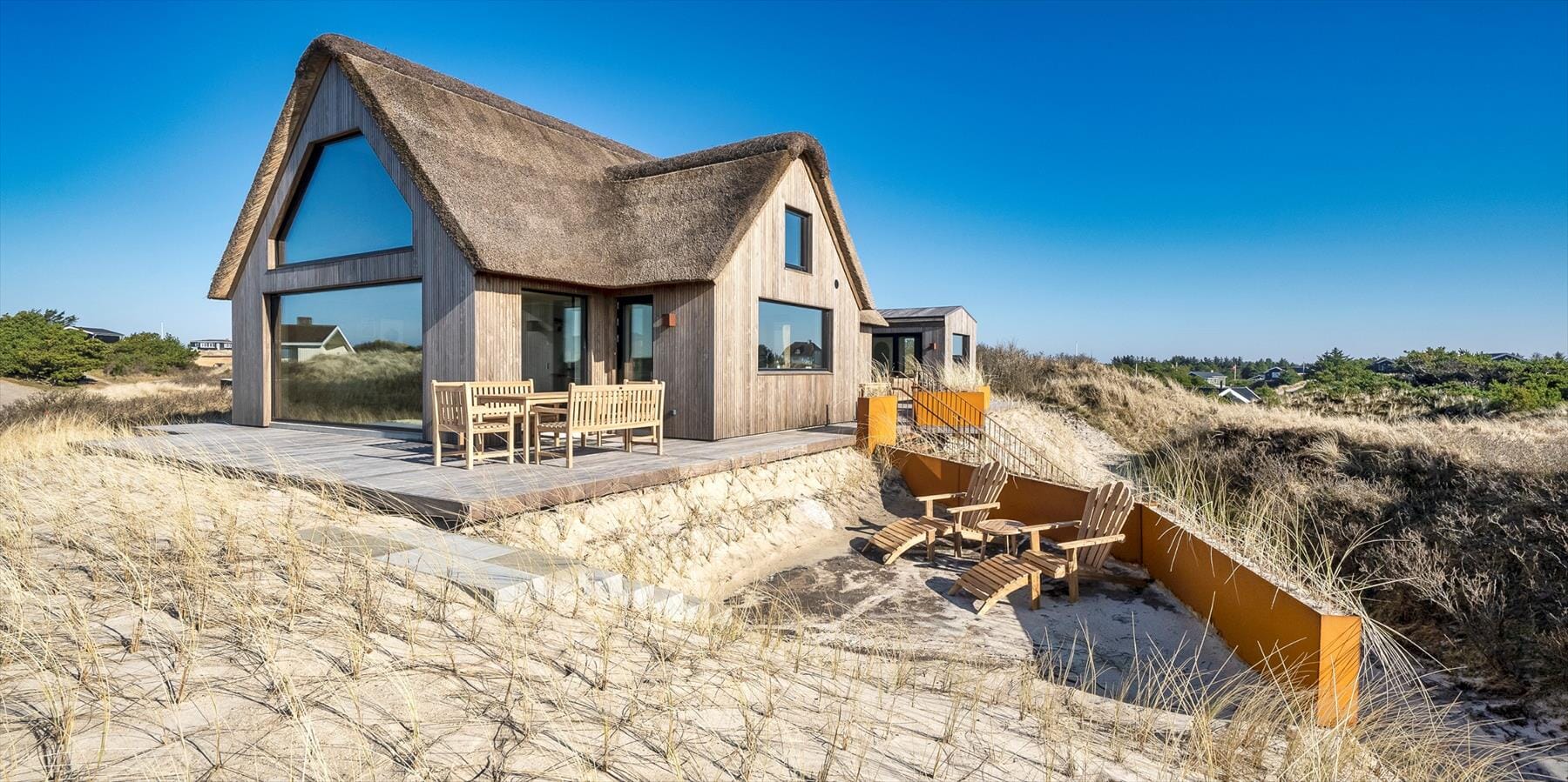 Huset hviler på en klitgrund, der omkranser hele ejendommen og skaber følelsen af at smelte sammen med naturen. En træterrasse strækker sig langs to sider af huset, hvor du kan fange morgensolen eller finde læ til eftermiddagskaffen. Derudover er der en særlig terrasse på et lavere niveau, anlagt på en gammel bunker midt i klitlandskabet. Den høje beliggenhed med trappeopgang giver fine udsigtspunkter, og det er kun en kort, stemningsfuld gåtur ned til stranden, så daglige dukkert- eller kystvandringer er lette at få ind i programmet. Udebruseren lige udenfor gør det nemt og dejligt at skylle sand og salt af efter en forfriskende svømmetur i Vesterhavet.