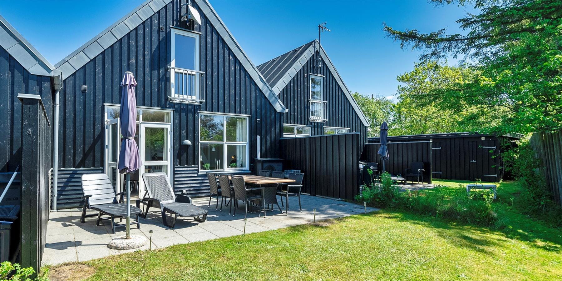 Huset har en afskærmet terrasse, hvor du kan nyde privatheden, selv om nabohusene ligger lige ved siden af. Terrassen er lunt placeret og indbyder til stille morgener med kaffe og rolige eftermiddage med en god bog; vindafskærmning og beplantning gør det behageligt at opholde sig ude, også når vestenvinden blæser. Den nemme adgang fra opholdsrummet gør det let at lade ude- og indeområder flyde sammen, og det private uderum føles som en naturlig forlængelse af hjemmets opholdsareal. Den omkringliggende beplantning skærmer af og skaber et grønt rum, hvor fuglesang og duften af klitplanter bidrager til feriestemningen.