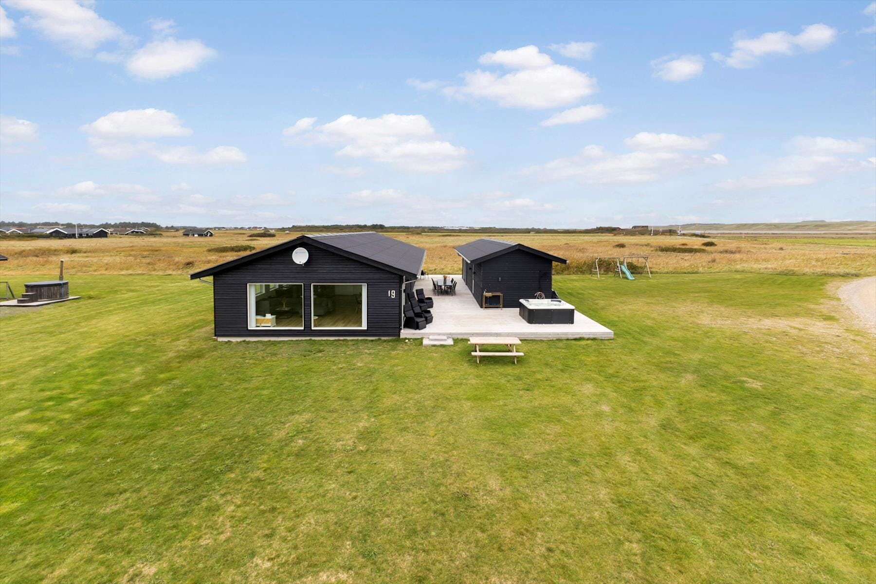 Terrassemiljøet omkring huset indbyder til udeliv i alle afskygninger. Start dagen med et udendørs brusebad i morgensolen, nyd eftermiddagen i det varme udespa – eller tag en dukkert igen senere på aftenen, når mørket falder på og stjernerne titter frem. Børnene vil elske at lege i sandkassen og kravle op ad klatrevæggen, mens de voksne nyder en stille stund på den store træterrasse med udsigt over det smukke landskab. Her er både læ og sol – og uanset om du vil slappe af med en kop kaffe eller et glas vin, er det let at finde sin egen favoritplads. Kører du elbil, er der også tænkt på det – huset har nemlig en CEE-kontakt IEC-60309 (5 polet, 3 faser med 16A), så du nemt kan lade bilen op under ferien.