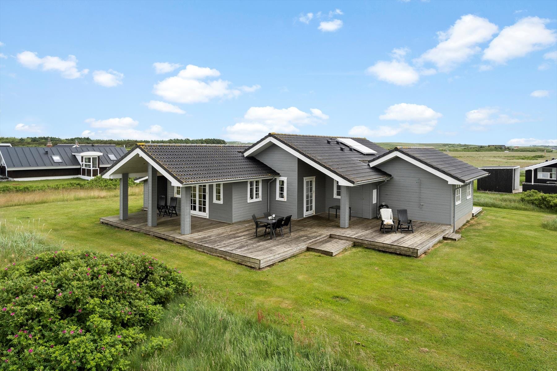 Når solen skinner, og vinden blæser mildt fra vest, er det oplagt at tilbringe ferien i det fri – og det bliver ekstra let her, for sommerhuset har en stor og indbydende terrasse, der er skabt til både afslapning og samvær. Start dagen med morgenkaffen i solen og rund den af med grillhygge under åben himmel. Der er plads til både liggestole, havemøbler og børneleg, og uanset om du drømmer om at slænge dig i solen med en god bog eller se børnene lege på plænen, finder du her de helt rigtige rammer. I haven kan du høre fuglene synge, og duften af saltvand i luften minder dig hele tiden om, hvor tæt du er på havet. Her får du følelsen af at være helt tæt på naturen – men samtidig med alle de bekvemmeligheder, der skaber den perfekte ferie.