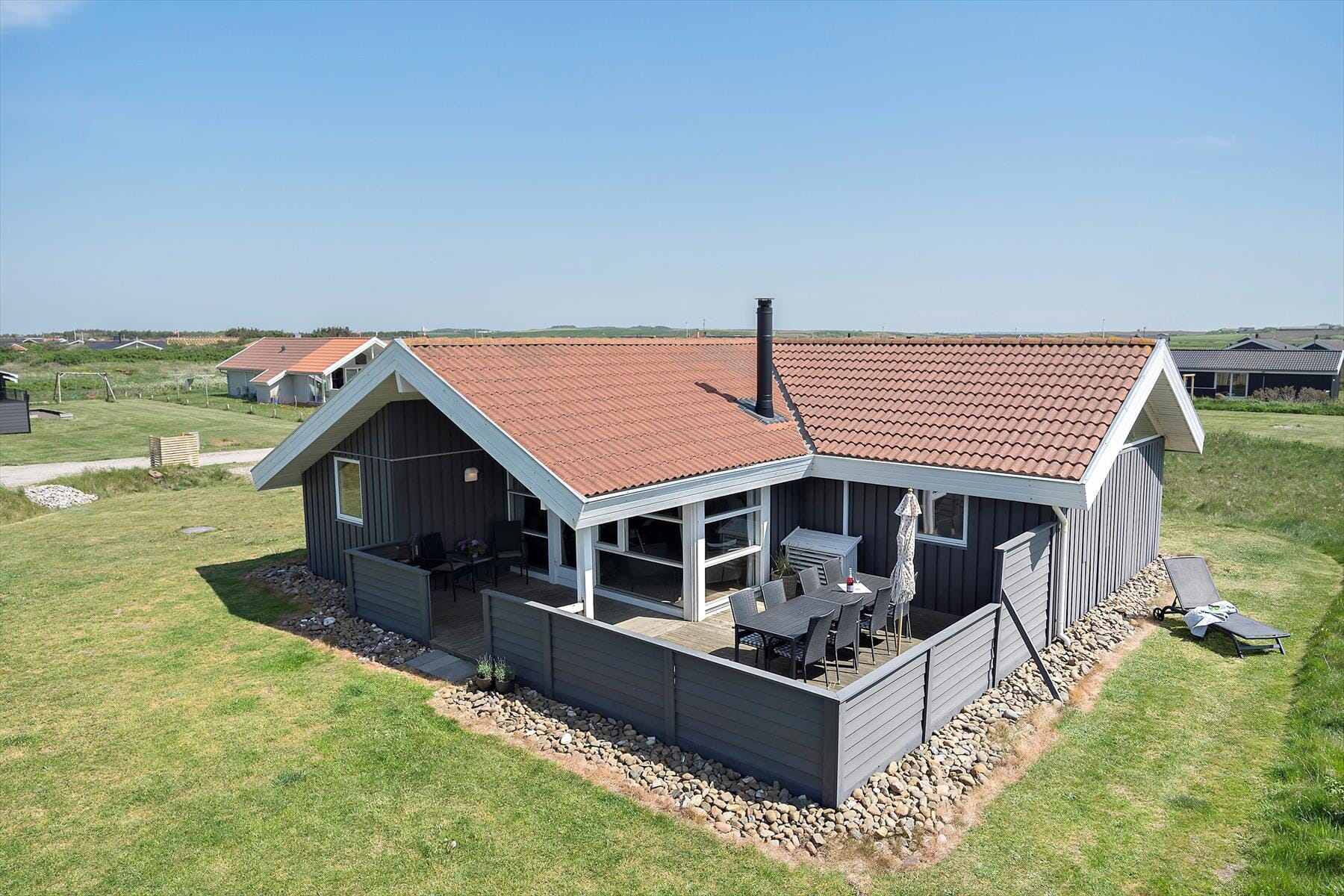 Med en solrig terrasse på hele 113 m² er der rig mulighed for at nyde ferielivet under åben himmel. På de lune dage kan du slå dig ned med en god bog i solen, samle familien omkring et dejligt måltid eller lade børn og hunde lege frit i de trygge omgivelser. Terrassen giver dig også mulighed for at finde læ, hvis vinden en sjælden gang tager til – og på de lange, lyse sommeraftener kan grillen nemt blive samlingspunktet for endnu flere hyggelige timer. Her kan du virkelig mærke, hvordan freden og naturen omkring Vejlby Klit indbyder til nærvær og afslapning.
