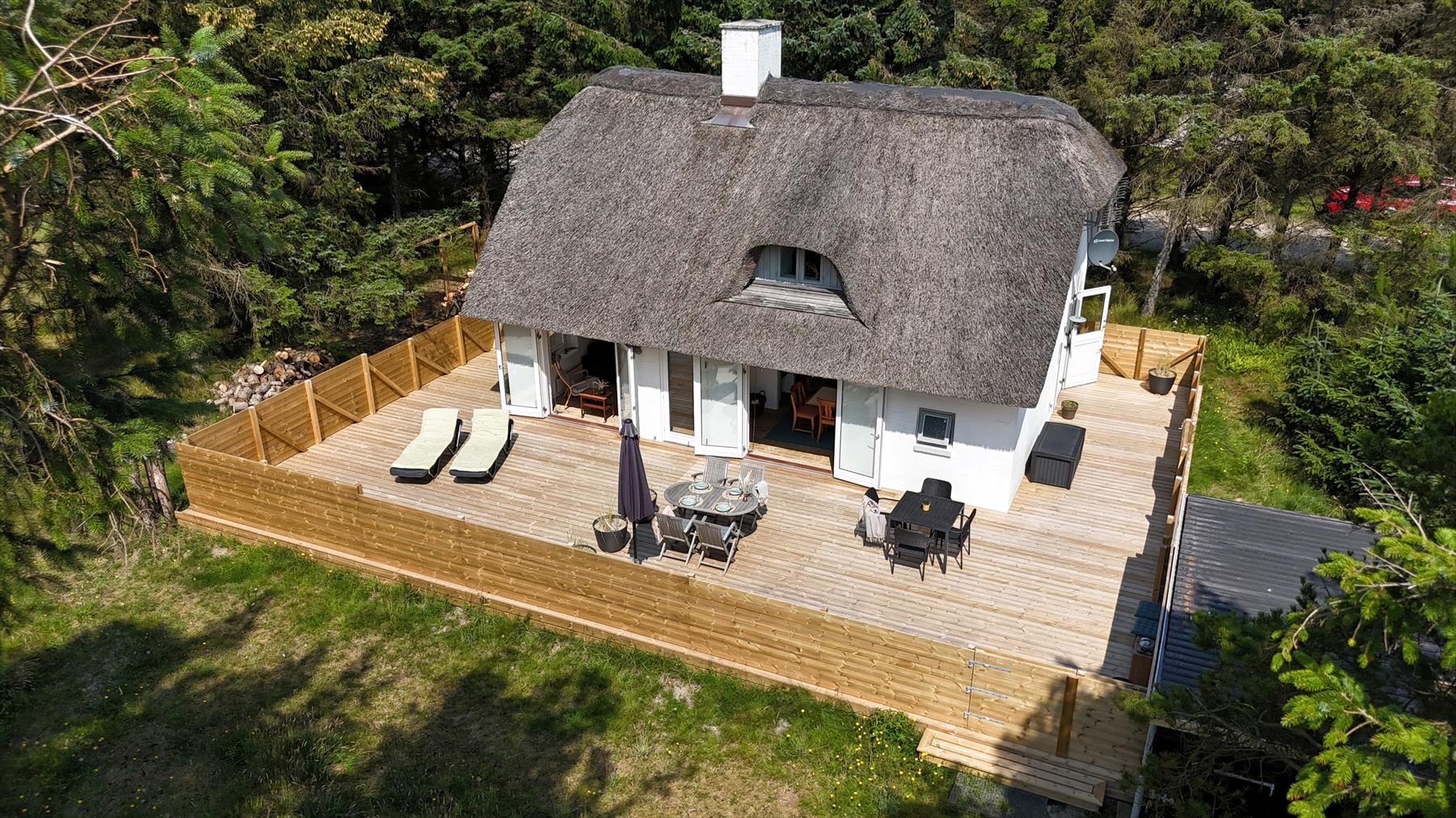 Sommerhusets fantastiske terrassemiljø på hele 112 m² breder sig næsten hele vejen rundt om huset, hvilket giver optimale muligheder for at finde sol, læ eller skygge hele dagen. Du kan slå dig ned med en kop kaffe i morgensolen, læse en god bog i eftermiddagens lune stråler eller samle familien til grillhygge under de lange, lyse sommeraftener. Haven byder på masser af plads til både afslapning og leg, så både børn og voksne kan nyde livet under åben himmel. Med naturen helt tæt på kan du høre fuglene synge og virkelig mærke feriestemningen brede sig.