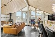 Bag husets klassiske sommerhusfacade gemmer der sig et indbydende og rummeligt indre, hvor komfort og hygge går hånd i hånd. Allerede ved ankomsten fornemmer du, at her er tænkt på både afslapning og aktivitet – ikke mindst i poolafdelingen, hvor du kan starte dagen med en frisk dukkert og slutte den af i saunaens varme og ro. Når de yngste har fået nok af vandpjask, kan I i stedet samles i det separate aktivitetsrum, hvor der venter både bordfodbold, fjernsyn og plads til timevis af sjov og spil. Huset rummer hele tre badeværelser, hvilket gør det nemt at være mange under samme tag – og køkkenet er ikke bare flot, men også udstyret med god service og plads til madlavning i fællesskab. Samlingspunktet er selvfølgelig stuen, hvor bløde sofaer, store vinduer og en varm atmosfære gør det let at falde til.