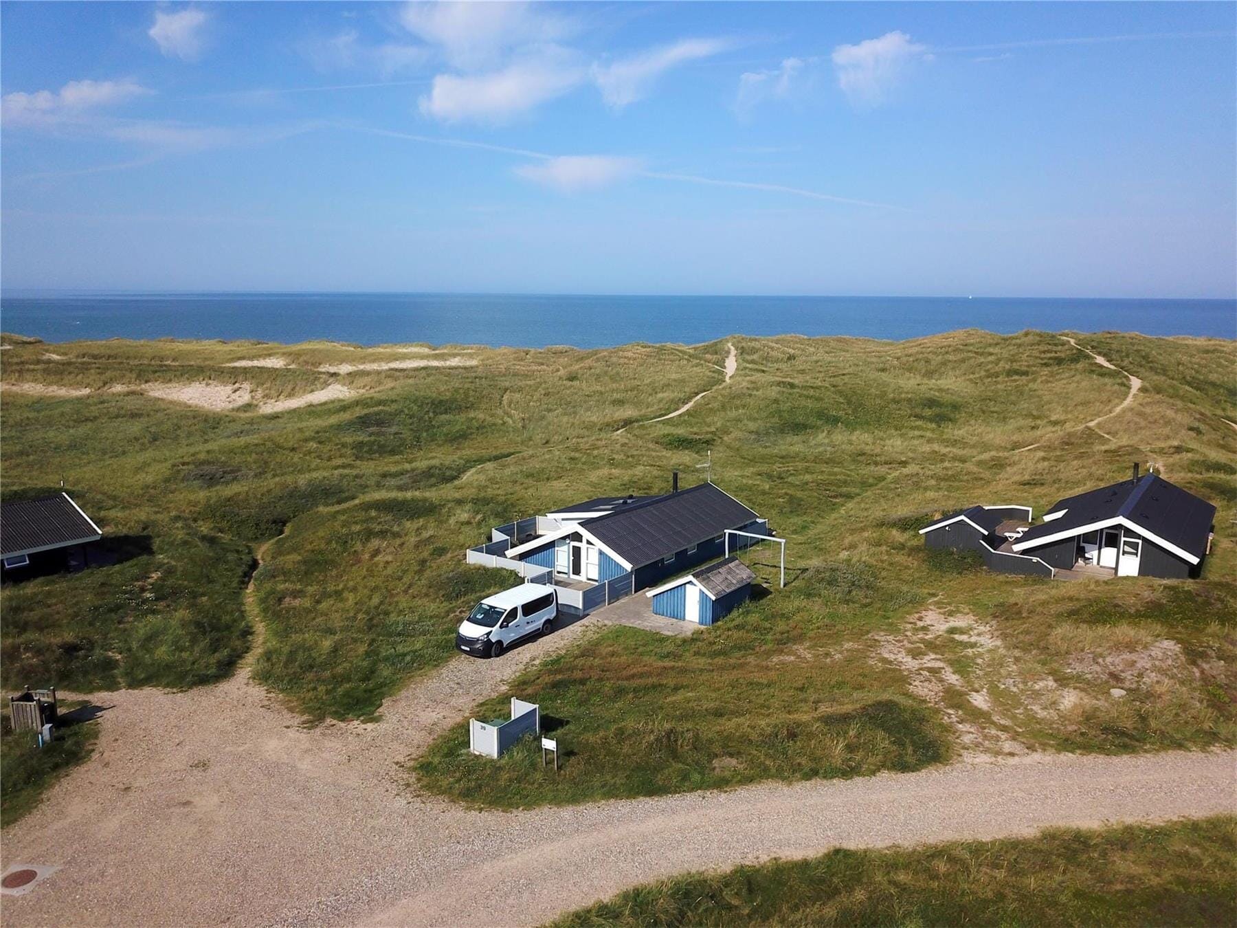 Når du træder udenfor, bliver du mødt af en skøn terrasse, der giver dig mulighed for at nyde både sommeraftener og kølige dage under åben himmel. Duften af saltvand og lyden af bølgerne t æt på gør oplevelsen endnu mere magisk. Terrassen er delvist overdækket, så du kan finde læ for vinden, mens du nyder solen eller serverer et måltid med friskfanget fisk på grillen. Børnene har god plads til leg og boldspil på den store naturgrund, og med blot én klitrække mellem dig og Vejlby Klit Strand er det nemt at tage en hurtig gåtur ned til vandkanten.