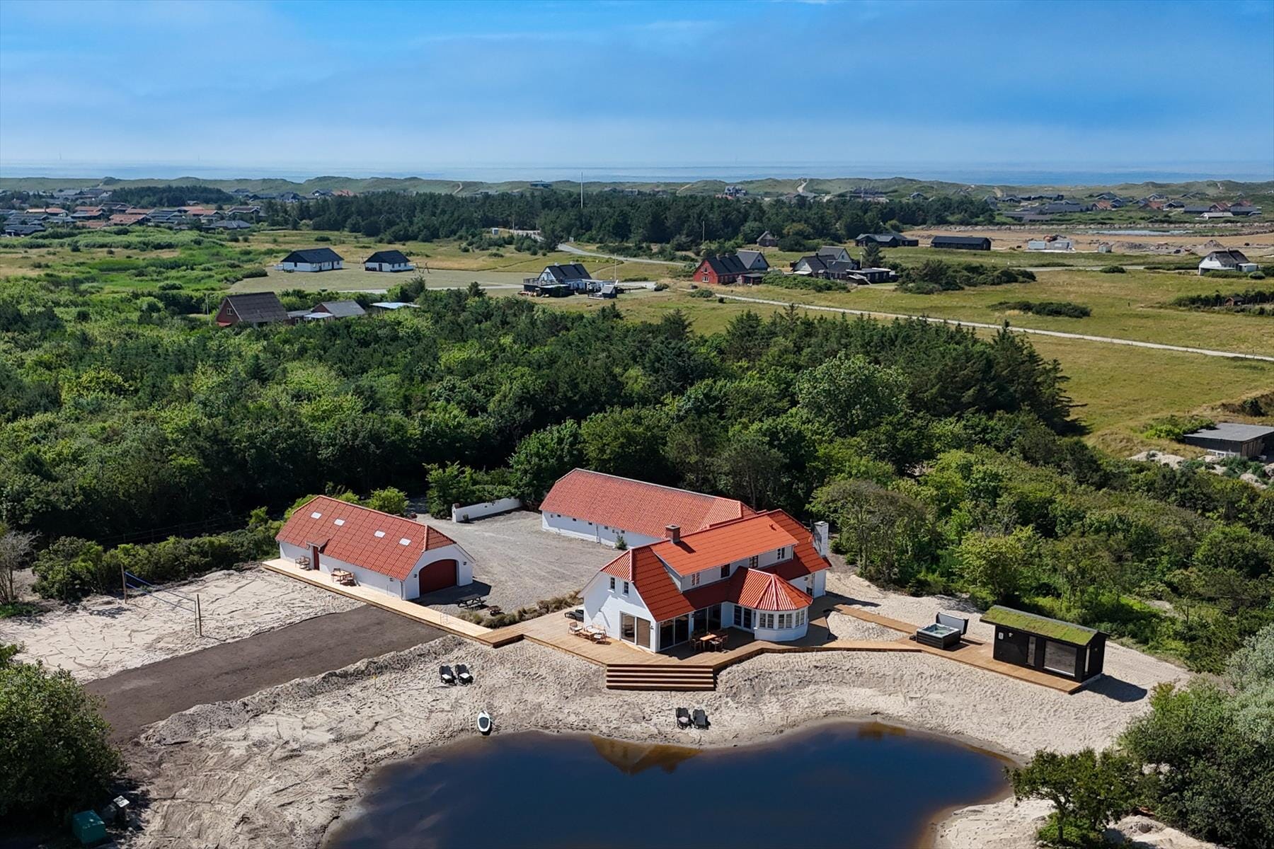 Lige udenfor venter ferieglæderne i lange baner. Det omkringliggende terrasse- og stisystem er noget helt særligt – med gangbroer og terrasser i alle retninger kan I altid finde sol, læ eller skygge, alt efter humør og vejr. De naturskønne omgivelser indbyder til ro og fordybelse, og fra saunaen og det udendørs spabad kan I nyde panoramaudsigten over den store sø, der ligger lige ved huset. Måske tager I en stille rotur i robåden, prøver balancen af på paddleboardet eller sætter gang i boldspillet på den private fodboldbane eller beachvolleybanen. Det er udendørsliv, når det er allerbedst – og det hele er jeres helt alene.