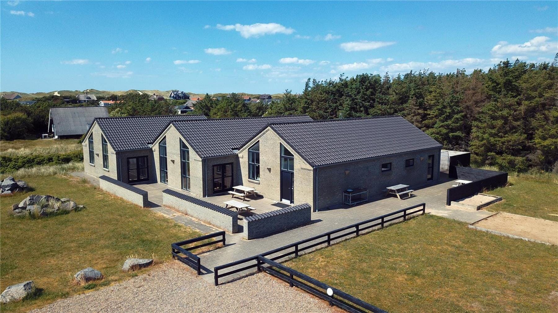 Udenfor fortsætter oplevelserne i det fri. Sommerhuset ligger på en stor, indbydende grund med god plads til både afslapning og leg. Den store terrasse indbyder til fælles måltider i solen, afslappede stunder i loungemøblerne eller måske bare en stille stund med en bog og fuglesang i baggrunden. Til børnene er der masser at give sig til i haven, hvor både et stort legetårn og gynger venter – og til de voksne (eller konkurrencelystne børn) er der en petanquebane klar til mange hyggelige timer. Hele området omkring huset føles fredeligt og privat, og med mulighed for at tage hunden med på ferie, bliver det hele familiens frirum.