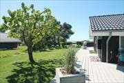 Stor skøn åben terrasse direkte ned til stranden og dermed udsigt udover vandet, samt en lille overdækket terrasse. I klart vejr kan man tydeligt se Fyn på den modsatte side. Ved feriehuset er der havemøbler, parasol, liggestole og grill.