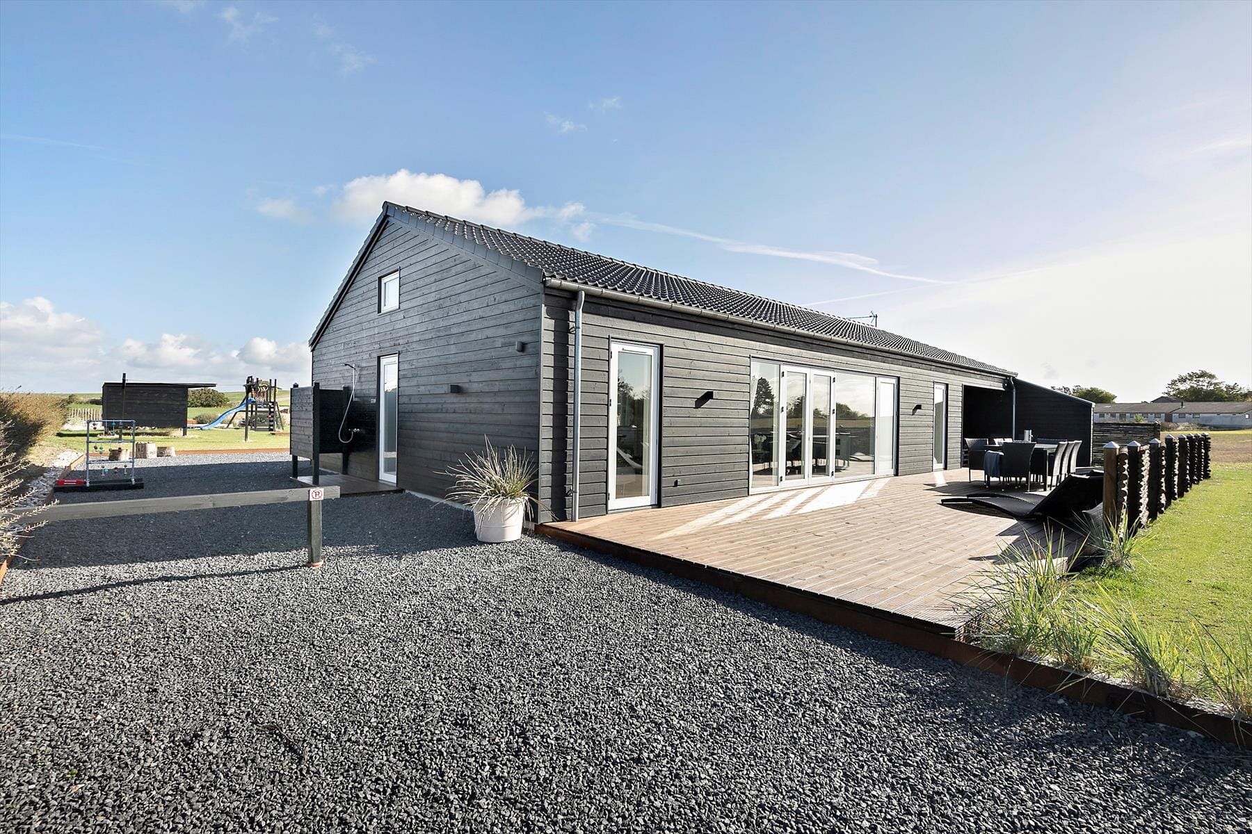 Nyt flot helårsisoleret sommerhus fra 2021 opført i en moderne arkitektur med en intim og hyggelig sommerhusatmosfære og en gennemtænkt indretning. Huset fremstår således med et elegant og gennemtænkt designtwist. Stor stue med loft til kip og store vinduespartier, som er opdelt i spiseafdeling samt opholdsstue, hvorfra der er udgang til delvis overdækket træterrasse. Lækkert og funktionelt køkken med god plads som er integreret med den store stue. Køkkenet indeholder kogeplader med induktion, indbygget ovn, mikroovn, opvaskemaskine og køleskab med fryser. Opholdsstue med chaiselong sofa, god spiseplads, Smart TV med danske DR kanaler samt mulighed for Streaming til TV2 Play, Netflix og Viaplay (kræver eget abonnement) og parabol med tyske kanaler. To badeværelser, et med bruseniche, vaskemaskiner og tørretumbler og et med bruseniche og badekar. Fire soveværelser, alle med dobbeltsenge (2 enkeltsenge som er sat sammen). Herudover er der en hems med stort vinduesparti med to ekstra sovepladser på madrasser.