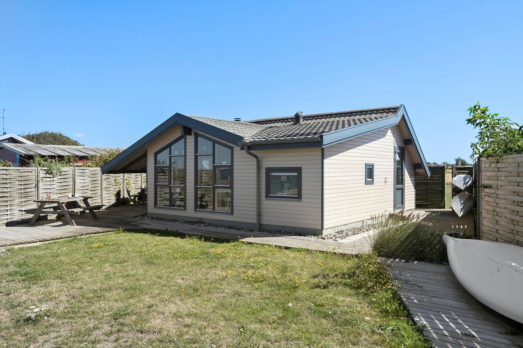 Fe­ri­e­hu­sets grund er på 732 m2, der har direkte adgang ned til stranden. Fra terrassen er der en suveræn udsigt over Storebælt og til Storebælstbroen. Ved huset er der havemøbler, parasol og gril. Der er desuden en kano til fri af­be­nyt­tel­se (be­nyt­tel­se er på eget ansvar). Parkering foregår ved en mindre offentlig par­ke­rings­plads, som befinder sig ca. 100 meter fra huset.